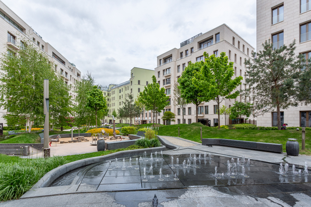 Инфраструктура комплекса обеспечивает комфорт и безопасность: гостей встречает круглосуточный консьерж в стильном лобби с бесшумными лифтами. На внутренней территории для жителей обустроен приватный сад с фонтаном для прогулок в самом центре города. Подземную часть комплекса занимает паркинг.